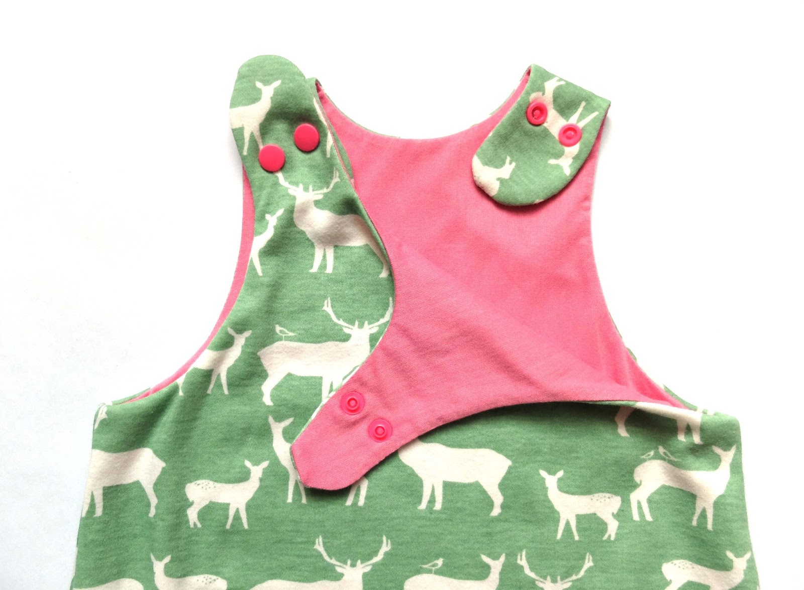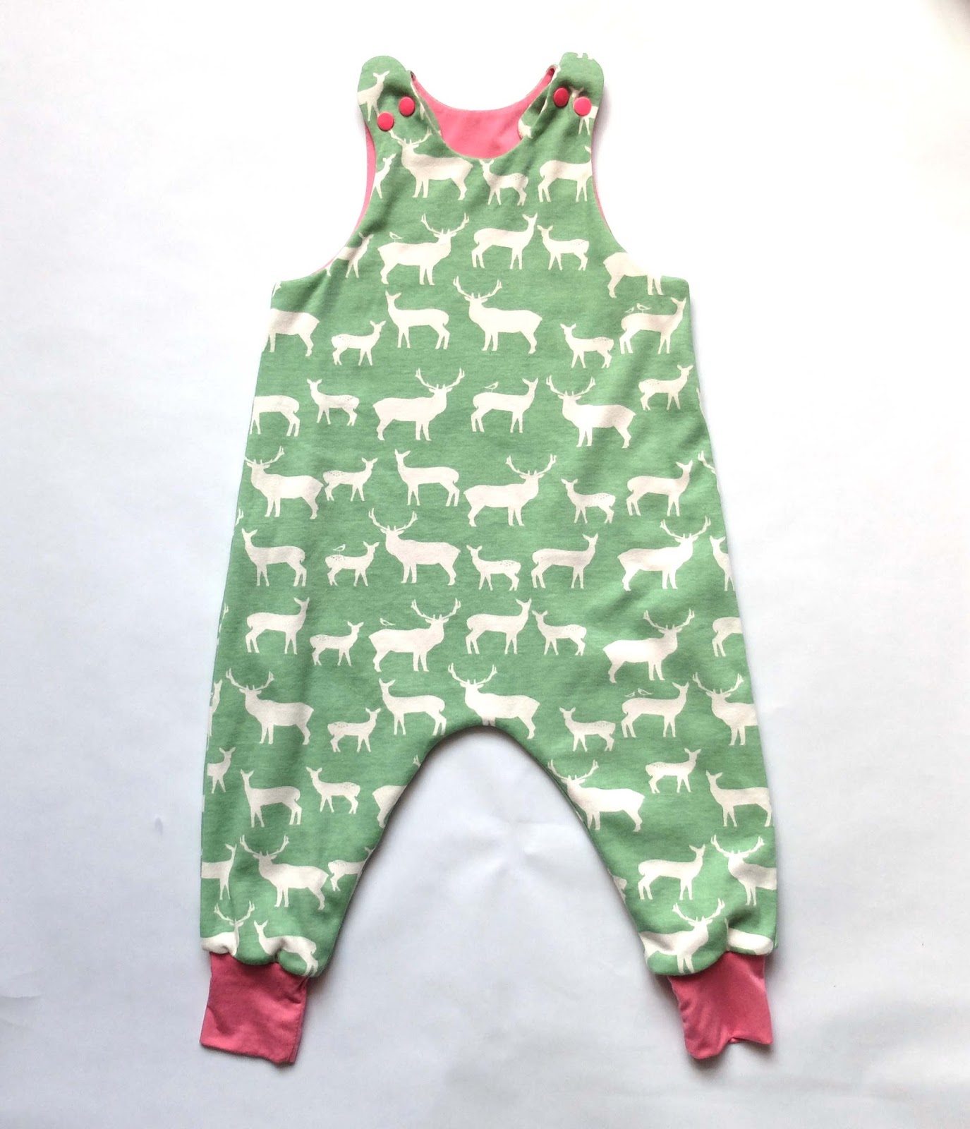The pattern is the reversible Jumpy Romper which is another pattern from the wonderful Puperita. This pattern was no different to the other ones I have made up in that it was an absolute dream to follow and so easy to make. I made it up in 12-18m for a friends little girl and the proportions look great. I used the overlocker for this one because I wanted a really quick satisfying project after all the fitting I had to do with Margot dress and this certainly delivered. I managed to whip this up in about 2 days. I absolutely love the pink jersey with the mint of the elk grove knit. Its such a beautiful colour combination for a girl, and I think one of my favourite. As I mentioned the pattern is reversible but why would you want to hide those handsome deer?