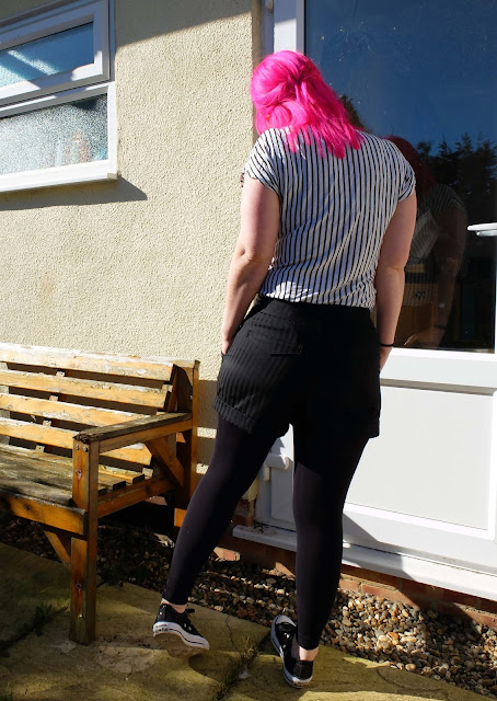 The fabric is some black striped cotton type fabric. I'm not sure exactly what to call it, it was donated to me from my sister in law but its got a lovely sort of tailored look to it which is why I thought they would work really nicely with this pattern. It was only a small amount of fabric so it was nice to make something with some structure with it. I tried really hard to match up the stripes where I could and its not a bad attempt as far as that goes. Sadly its near impossible to to take good pictures of black clothing so I had to brave the early spring sunshine in my eyes to take these photos.