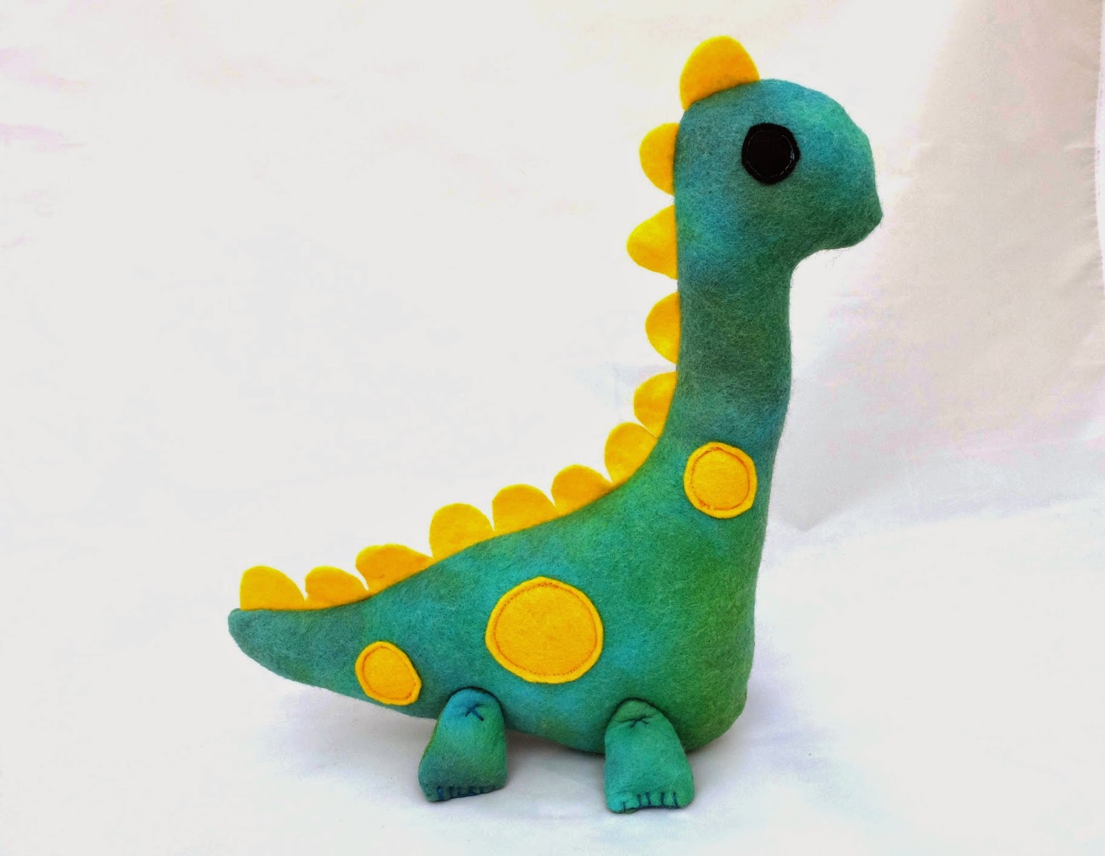 He is made from pure wool felt. When I saw the pattern I knew I had the perfect piece of material to make him out of. The body is a hand felted piece of fabric in teal and green, I hear you, its like it was made for this project. I've had it in my craft room for years and you know when you can't bear to use something because you know the perfect project will come along... well here's proof it does in the end. Because its hand felted real wool as well it gives it a gorgeous texture, its almost scaly just like a real dino!